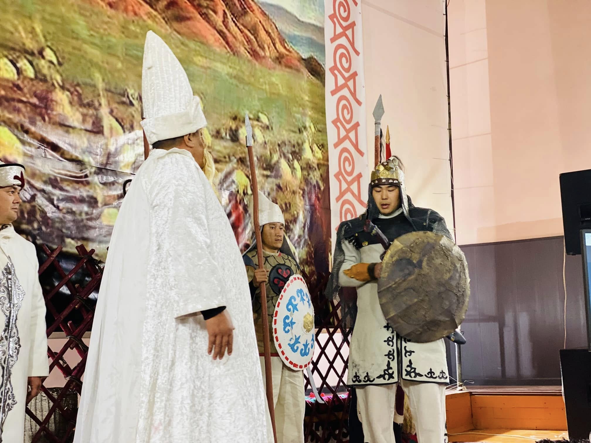 Иш-чара алгач Манастын Кошойго жолугушуусун сахналаштырылган сценкасы менен башталып,